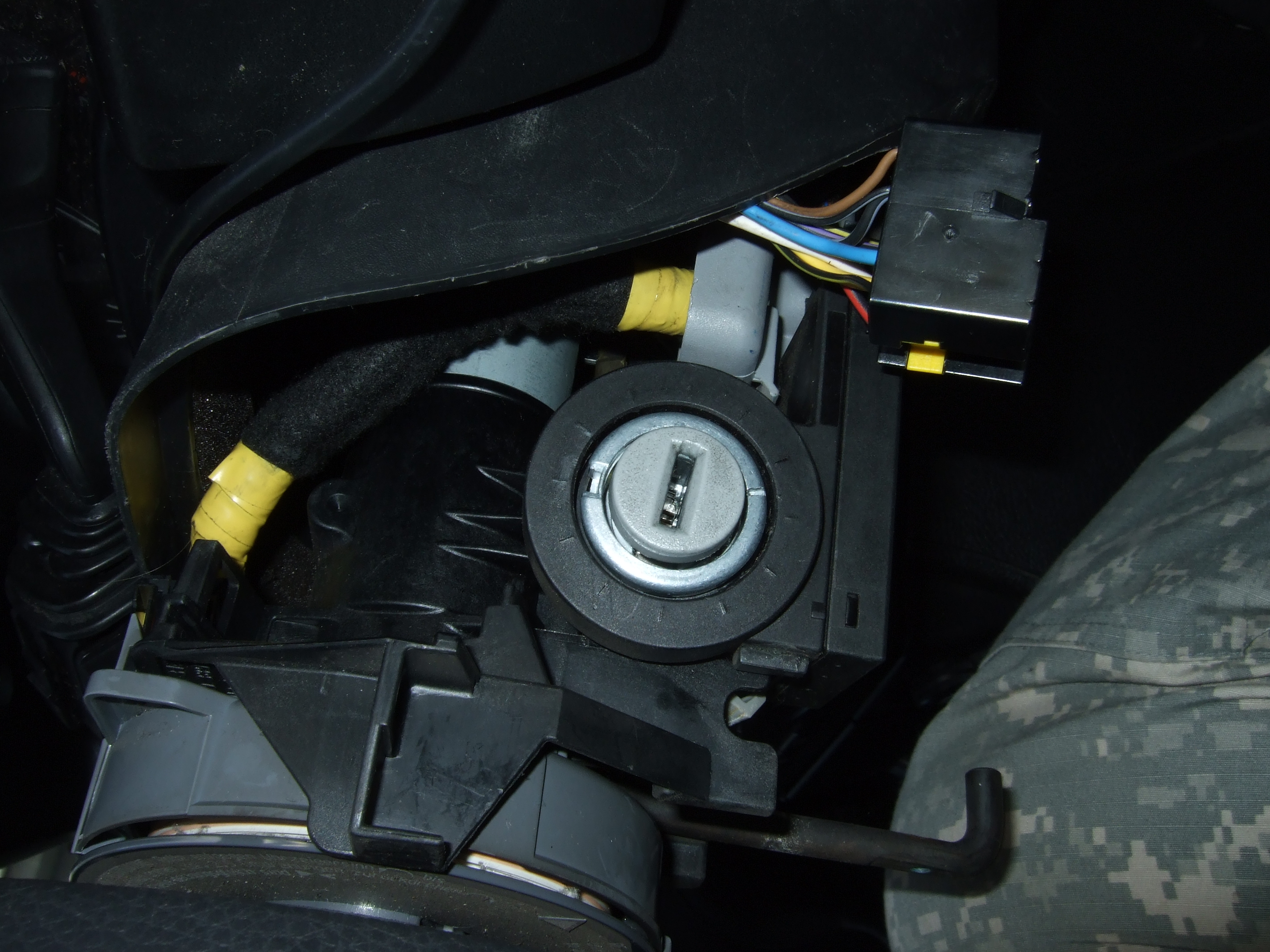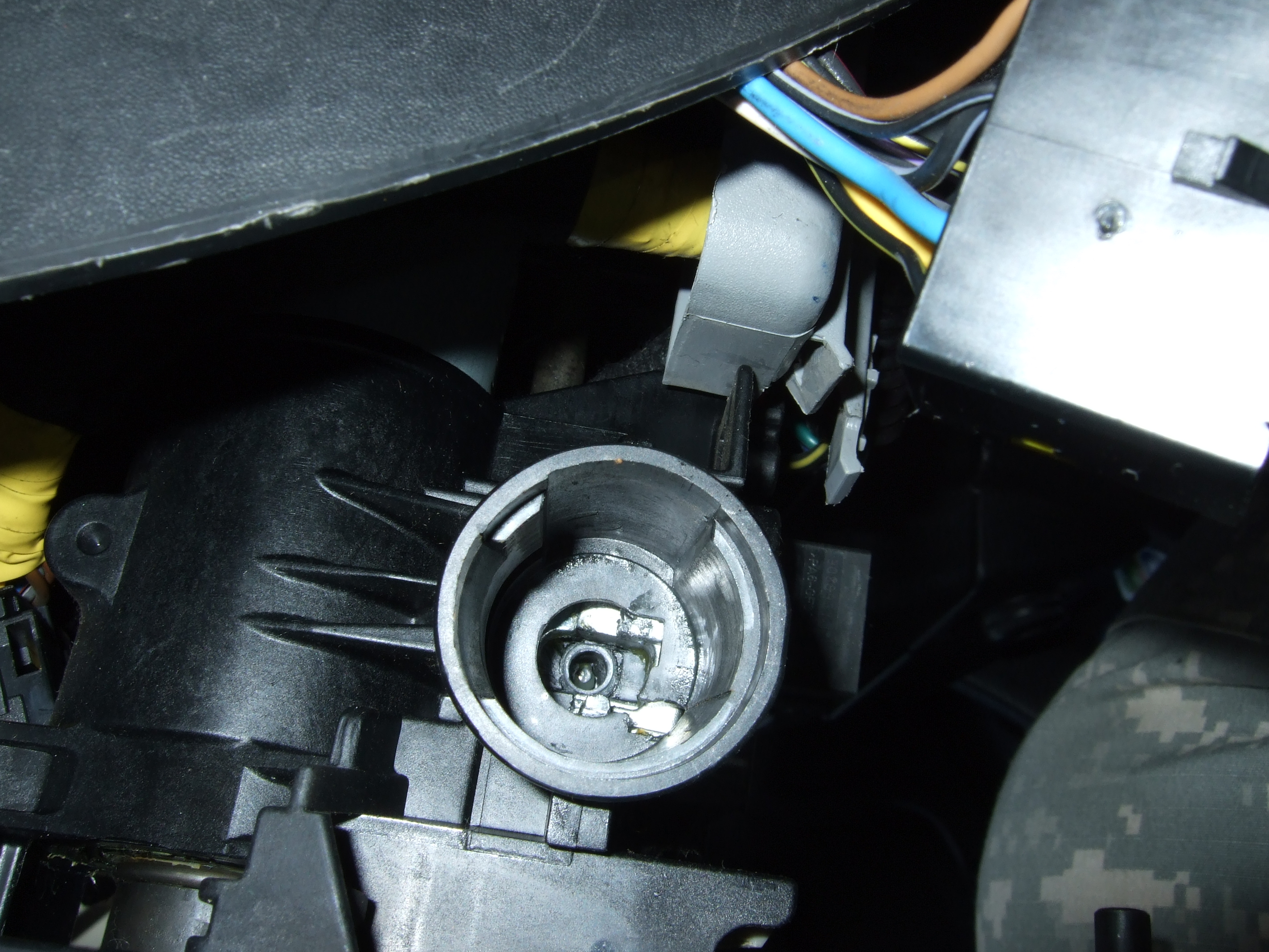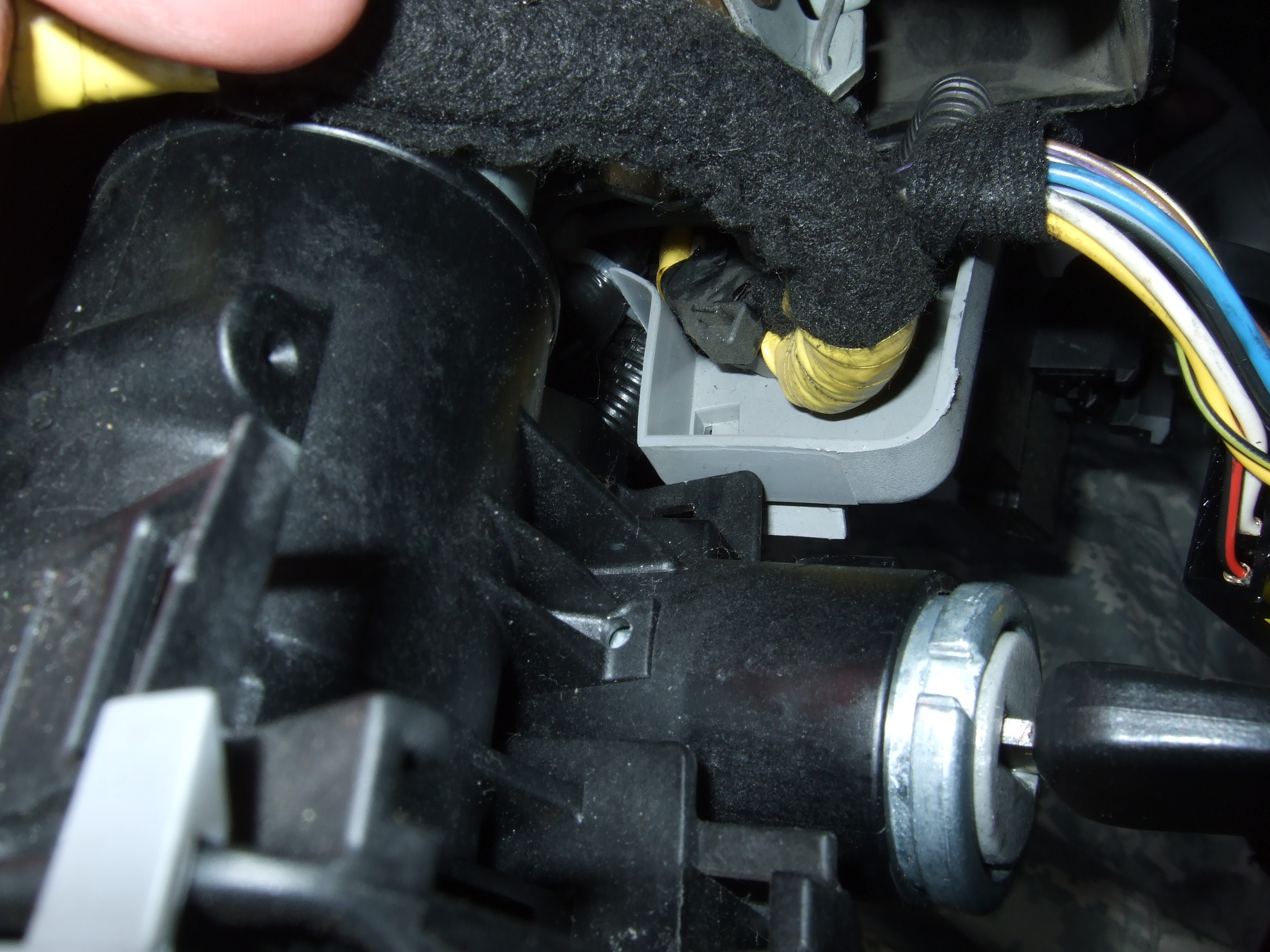 1. Снять кожух рулевой колонки. ОТКЛЮЧИТЬ АКБ! Снять правый подрулевой переключатель. Вставить ключ в замок и повернуть до положения I.