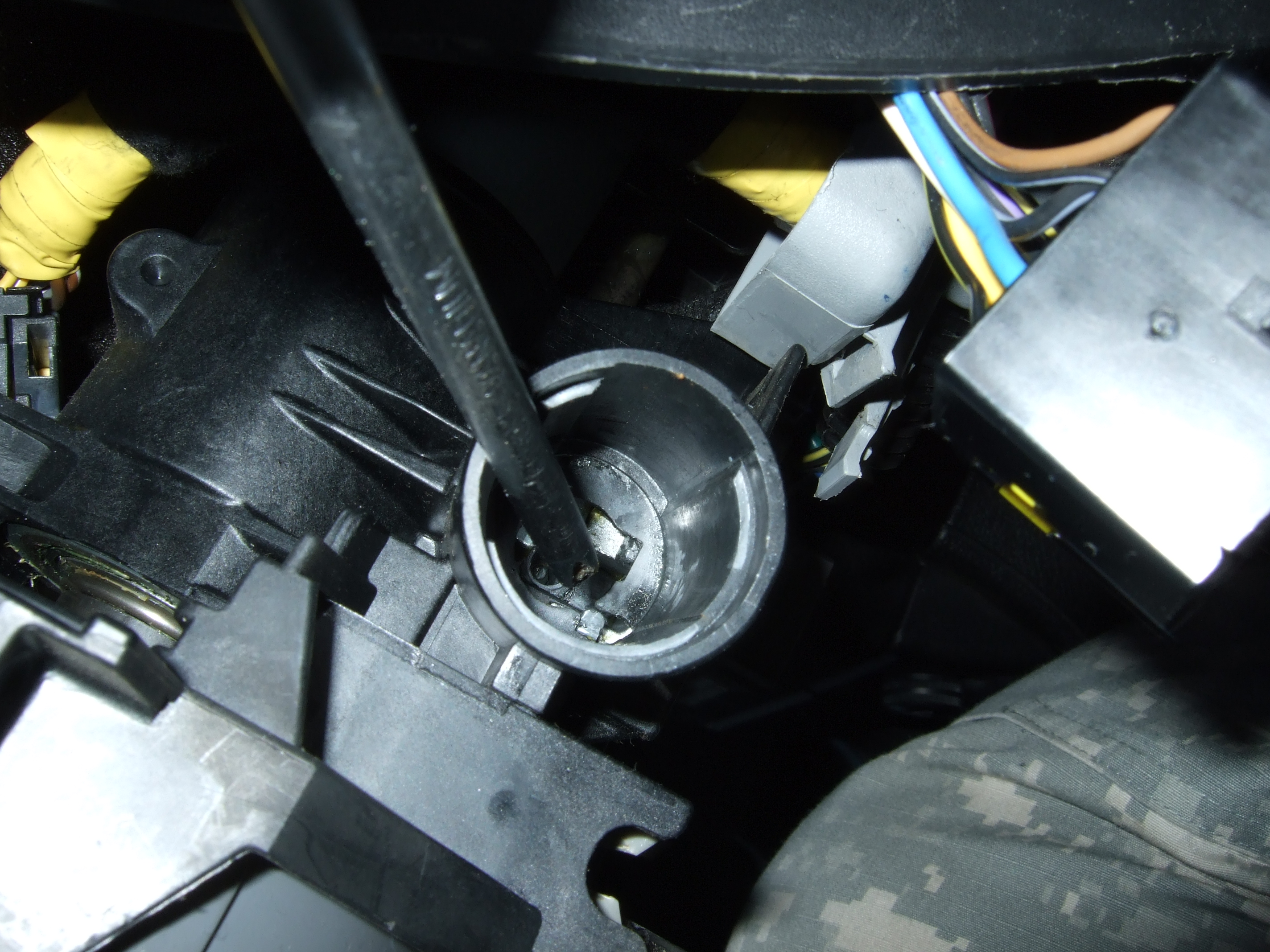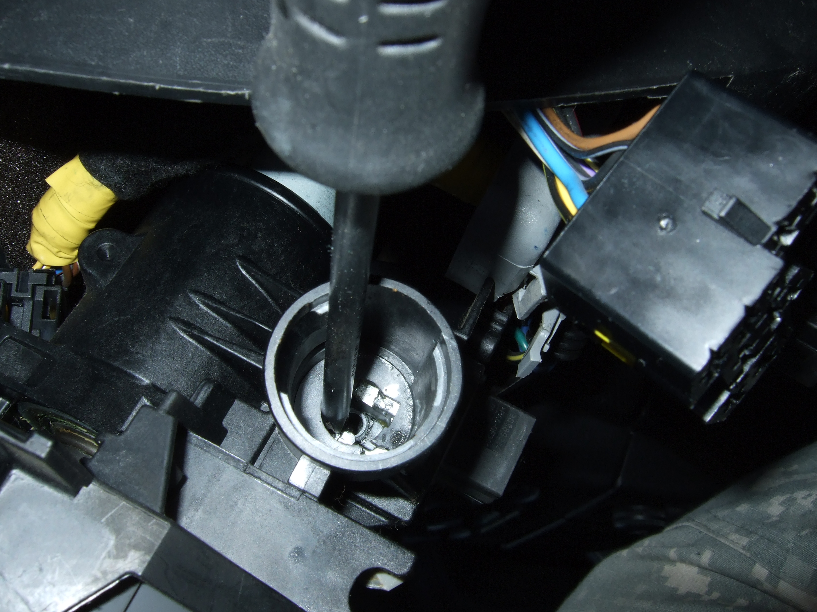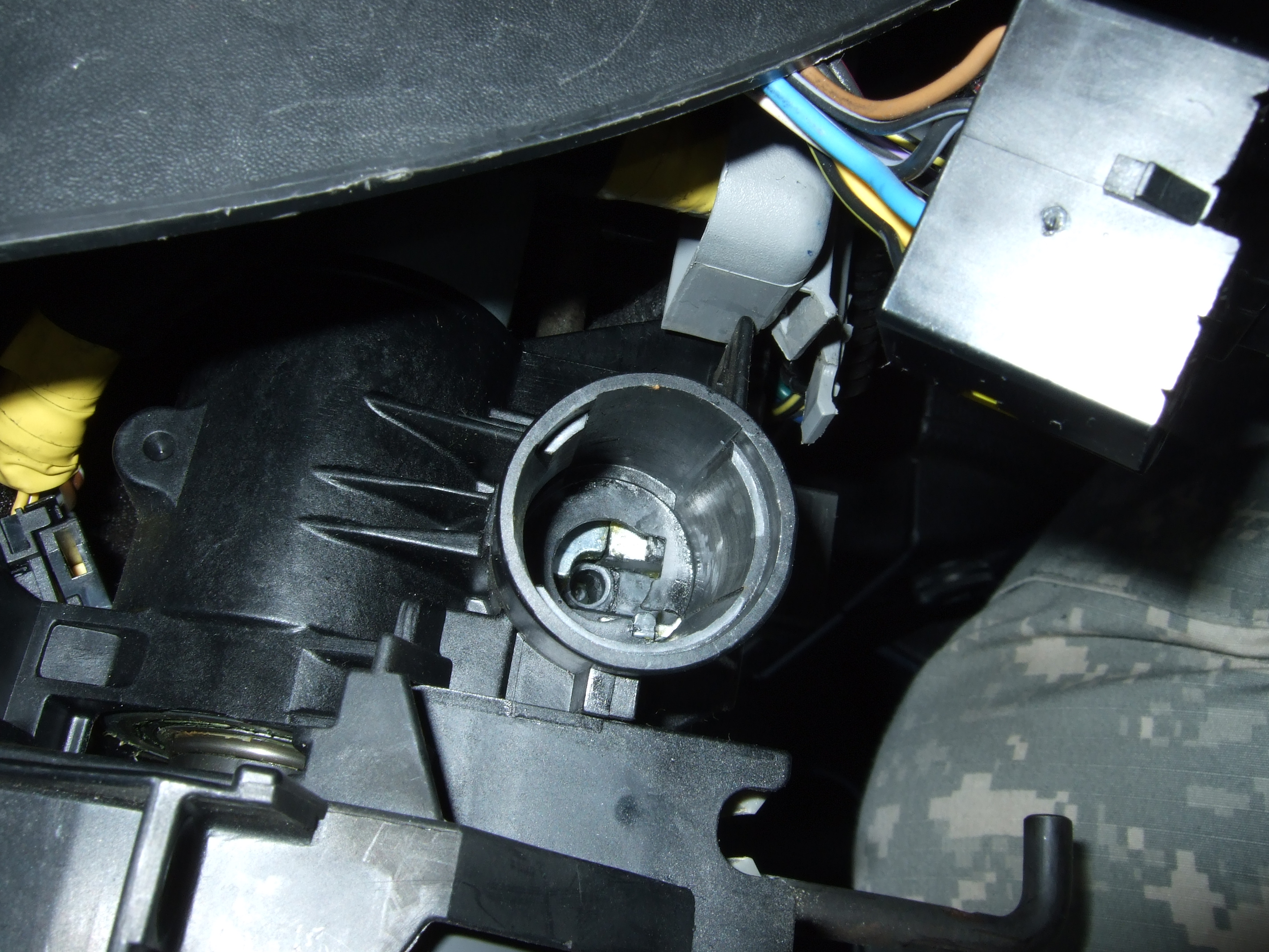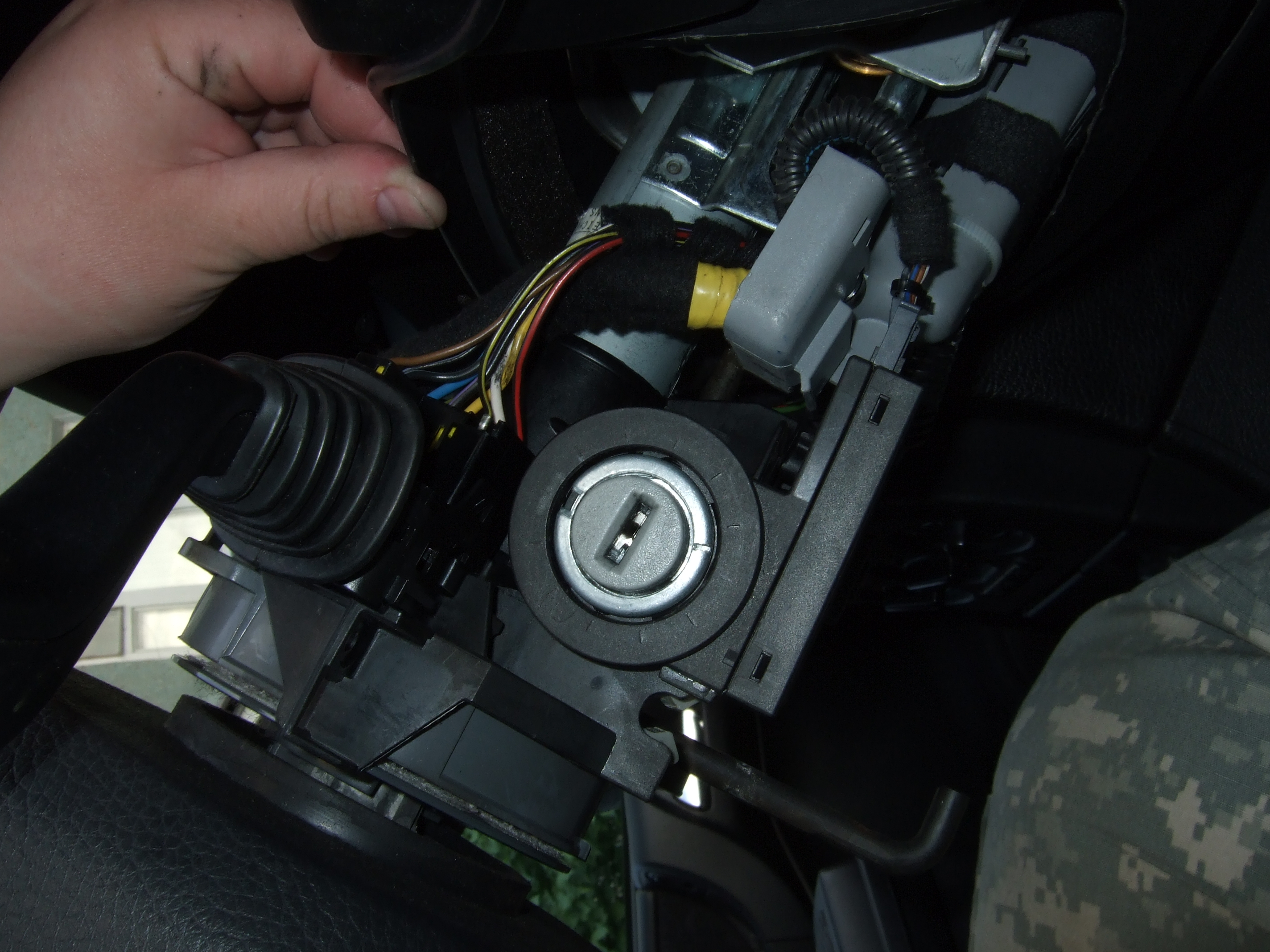 1. Снять кожух рулевой колонки. ОТКЛЮЧИТЬ АКБ! Снять правый подрулевой переключатель. Вставить ключ в замок и повернуть до положения I.