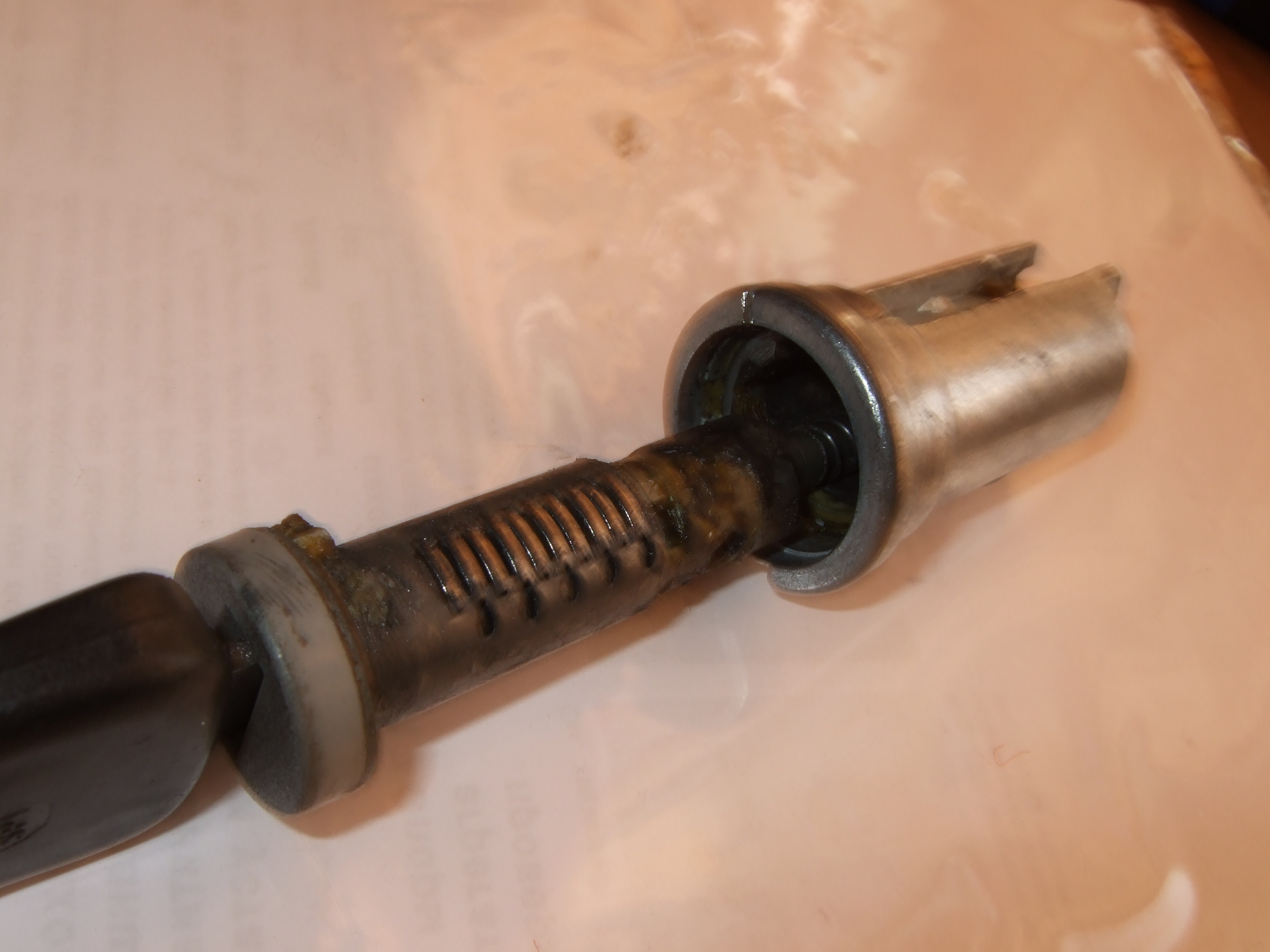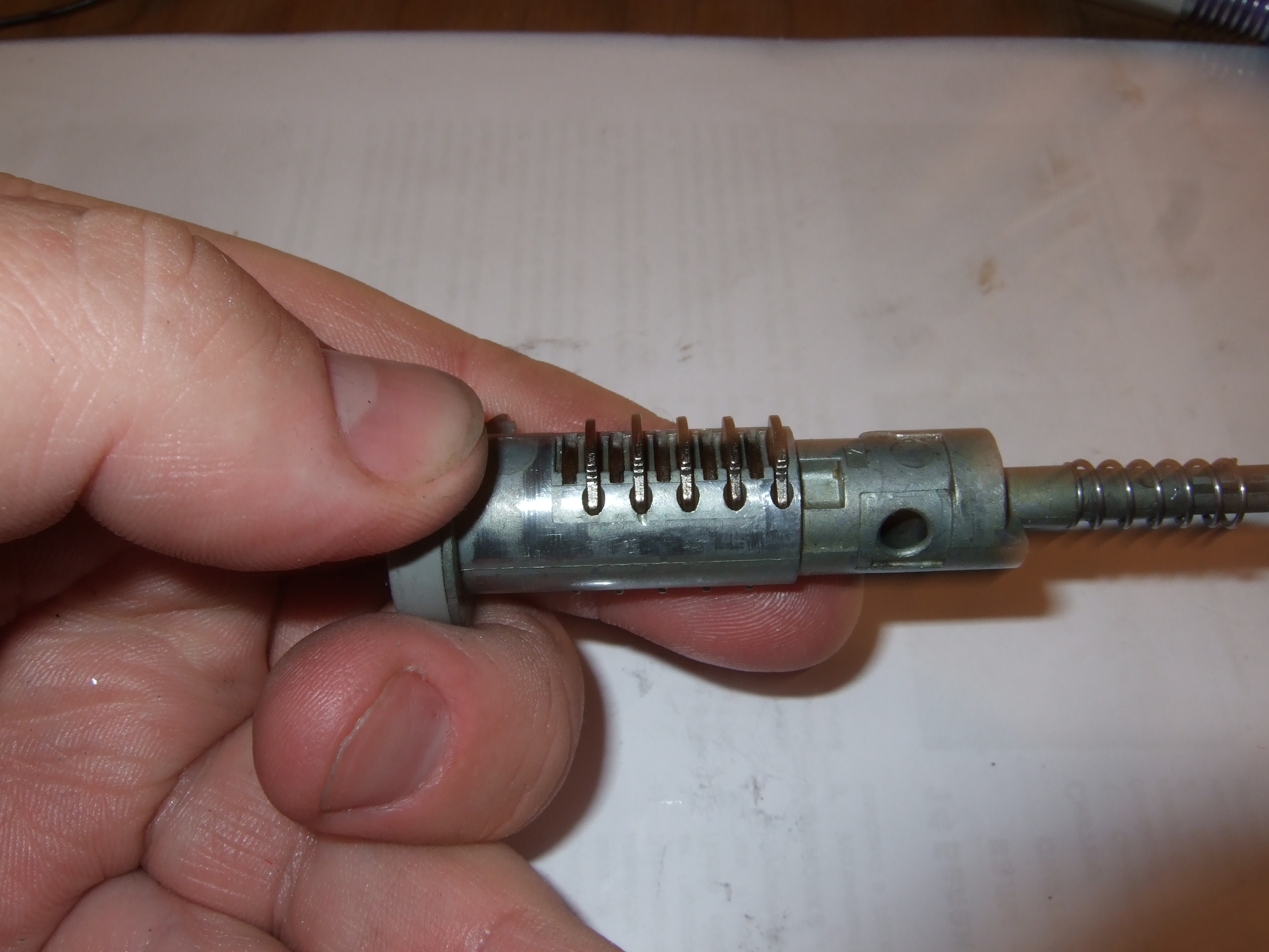 16. Надеваем корпус на личинку, вставляем штифт на пружинке. Замок собран. Тут желательно штифт и место где он ходит смазать тонким слоем Литола, но у меня не было.