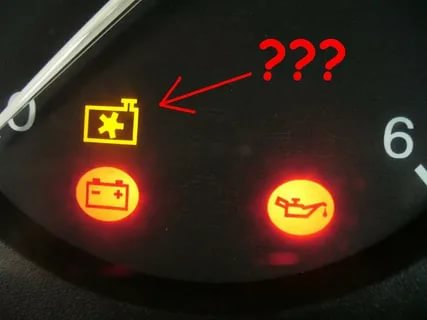 Столкнулся с неприятной ситуацией. При возвращении домой из поездки длиной километров около 40, машина повела себя странно. При движении начала дергаться, потом вообще заглохла. Топливо – в наличии, температура по указателю на панели – около 90 градусов. Все жидкости – в норме. После того, как двигатель заглох, снова завелся сразу же. Не сразу обратил внимание, что загорается индикатор системы охлаждения (картинку нашел в интернете).
